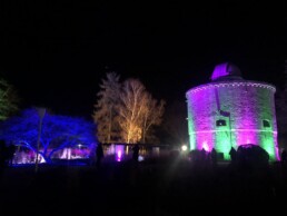 Der Lichterzauber beginnt am Besucherzentrum am Haupteingang, erstreckt sich entlang der großen Wiese, weiter geht’s über Danakil bis hin zum neuen Rosengarten und dem Deutschen Gartenbaumuseum. Zu den Hauptattraktionen zählen das Wasserschild, eine 20 Meter hohe Fontäne, auf die Videos projiziert werden, und der bunt beleuchtete Aussichtsturm.